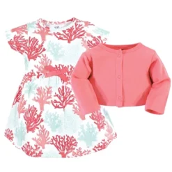 Touched By Nature Girls Infant, Toddler, And Kids Organic Cotton Dress And Cardigan, Coral Reef