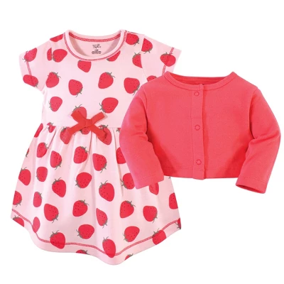 Touched by Nature dress and cardigan set is the cutest year-around outfit for your little girl. Both dress and cardigan are made from super soft 100% organic cotton. Dress is short-sleeved to keep cool while cardigan offers long sleeves and snap closure for cooler nights. Fun coordinating color and prints. Touched by Nature Baby and Toddler Girl Organic Cotton Dress and Cardigan 2pc Set, Strawberries is a great baby essentials set for your little one.