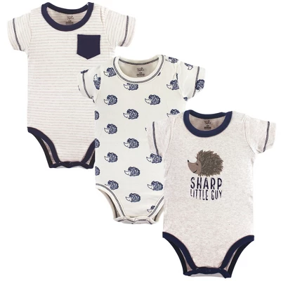 Touched by Nature offers soft organic cotton clothing for the gentlest touch on sensitive and delicate baby skin. Our organic bodysuits feature adorable prints, embroideries, stripes and solids and provide a comfortable base layer that’s great for pairing with pants, shorts, or even wearing under outfits. Our bodysuits are comfortable and cozy for all-day, everyday wear for your little one. Our bodysuits are an essential part of baby’s wardrobe. Touched by Nature Baby Boy Organic Cotton Bodysuits 3pk, Hedgehog is a great baby essentials set for your little one.