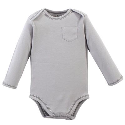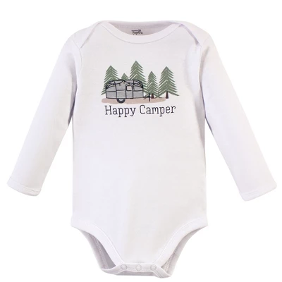 Touched by Nature offers soft organic cotton clothing for the gentlest touch on sensitive and delicate baby skin. Our organic bodysuits feature adorable prints, embroideries, stripes and solids and provide a comfortable base layer that’s great for pairing with pants, shorts, or even wearing under outfits. Our bodysuits are comfortable and cozy for all-day, everyday wear for your little one. Our bodysuits are an essential part of baby’s wardrobe. Touched by Nature Baby Boy Organic Cotton Long-Sleeve Bodysuits 5pk, Happy Camper is a great baby essentials set for your little one.