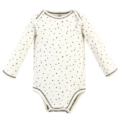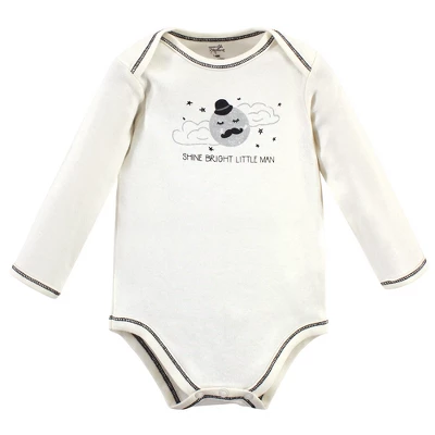 Touched by Nature offers soft organic cotton clothing for the gentlest touch on sensitive and delicate baby skin. Our organic bodysuits feature adorable prints, embroideries, stripes and solids and provide a comfortable base layer that’s great for pairing with pants, shorts, or even wearing under outfits. Our bodysuits are comfortable and cozy for all-day, everyday wear for your little one. Our bodysuits are an essential part of baby’s wardrobe. Touched by Nature Baby Boy Organic Cotton Long-Sleeve Bodysuits 5pk, Mr. Moon is a great baby essentials set for your little one.