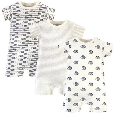 Touched by Nature is an organic cotton brand with beautifully designed clothing, bibs, blankets, hair accessories and socks made of premium organic cotton fabric. Organic cotton feels super soft on skin as the fibers are natural and breathable. Organic cotton is made without the use of synthetic pesticides and fertilizers, so it is an environmentally-friendly alternative compared to traditional farming methods. Touched by Nature rompers are an essential part of baby’s wardrobe. Our cotton rompers feature adorable prints, embroideries, stripes and solids and are comfortable one-piece clothing for your little one. Our rompers are comfortable and cozy for all-day, everyday wear and great for warmer temperatures. Touched by Nature Baby Boy Organic Cotton Rompers 3pk, Hedgehog is a great baby essentials set for your little one.