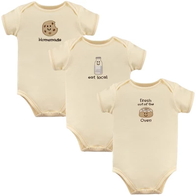 Touched by Nature offers soft organic cotton clothing for the gentlest touch on sensitive and delicate baby skin. Our organic bodysuits feature adorable prints, embroideries, stripes and solids and provide a comfortable base layer that’s great for pairing with pants, shorts, or even wearing under outfits. Our bodysuits are comfortable and cozy for all-day, everyday wear for your little one. Our bodysuits are an essential part of baby’s wardrobe. Touched by Nature Organic Cotton Bodysuits 3pk, Oven is a great baby essentials set for your little one.