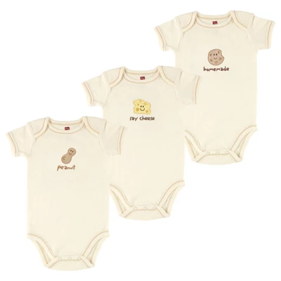 Touched by Nature offers soft organic cotton clothing for the gentlest touch on sensitive and delicate baby skin. Our organic bodysuits feature adorable prints, embroideries, stripes and solids and provide a comfortable base layer that’s great for pairing with pants, shorts, or even wearing under outfits. Our bodysuits are comfortable and cozy for all-day, everyday wear for your little one. Our bodysuits are an essential part of baby’s wardrobe. Touched by Nature Organic Cotton Bodysuits 3pk, Peanut is a great baby essentials set for your little one.