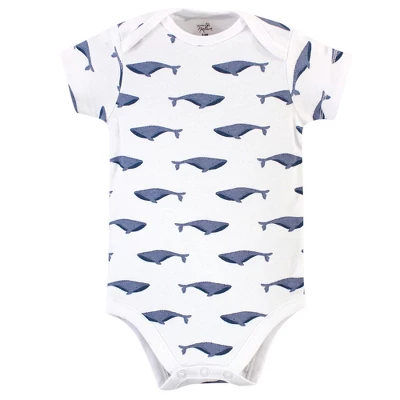 Touched by Nature offers soft organic cotton clothing for the gentlest touch on sensitive and delicate baby skin. Our organic bodysuits feature adorable prints, embroideries, stripes and solids and provide a comfortable base layer that’s great for pairing with pants, shorts, or even wearing under outfits. Our bodysuits are comfortable and cozy for all-day, everyday wear for your little one. Our bodysuits are an essential part of baby’s wardrobe. Touched by Nature Organic Cotton Bodysuits 5pk, Blue Whale is a great baby essentials set for your little one.